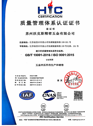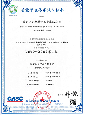 沃克斯在2006年通过了ISO9001质量认证,目前又开展了16949体系的宣导和培训工作,我们致力于通过系统化的质量管控手段和持续改善来公司的质量水平。
